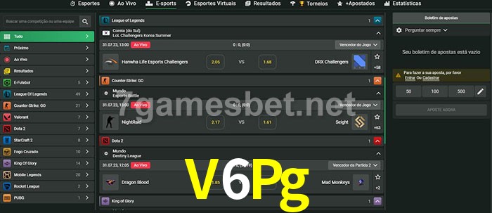 O V6Pg oferece uma grande seleção de opções de apostas em e-sports com probabilidades competitivas